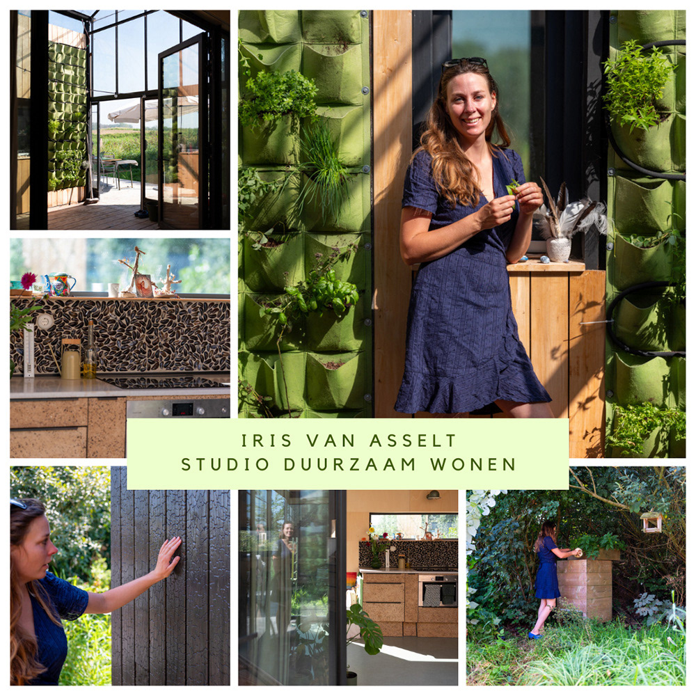 Iris van Asselt van Studio Duurzaam Wonen woont met haar gezin in een zelfgebouwd, volledig duurzaam en circulair huis in een eco-community. Zij maakt duurzame interieurontwerpen voor particulieren en bedrijven volgens de SUB-methode: Save, Use en Buy, waarbij de nadruk ligt op het maken van duurzame keuzes. Naast haar werk als interieurontwerper geeft ze ook lezingen om anderen te inspireren.